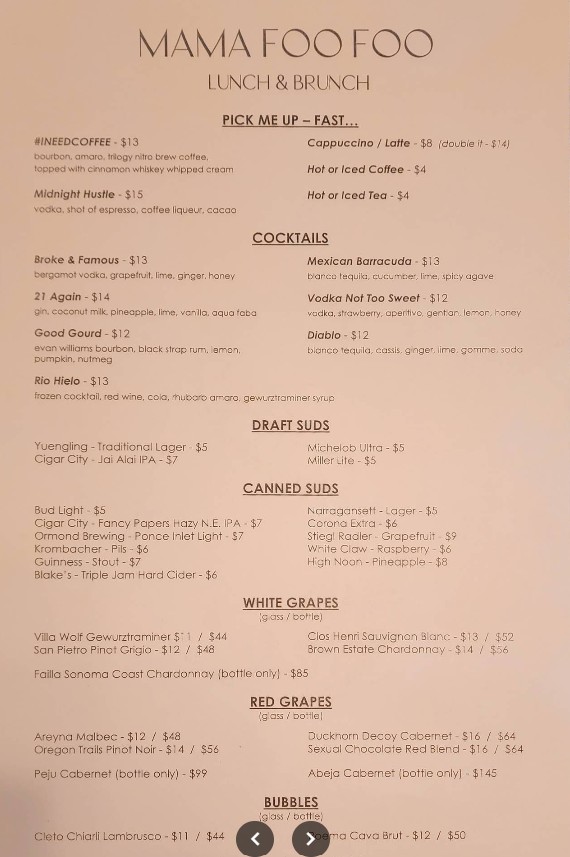My family and I visited Mamá Foo Foo on a Saturday after seeing their advertisement for a Latin Night experience. We drove in from different cities (Orlando and Tampa), and we were excited to have dinner and then enjoy music and dancing afterward. The restaurant itself is beautiful, it has a great vibe, unique décor, and a nice view overlooking the bay. The atmosphere definitely has potential. However, the experience fell short in several areas. The menu was limited because several items were unavailable, and the food we were able to order was unfortunately not very good. My brother in law also tried ordering a beer, and they didn’t have any, which was surprising for a restaurant/lounge environment. After dinner, we were looking forward to Latin music as advertised, since that was the reason we chose this location. But the DJ mostly played hip-hop and only put on one Latin song here and there when requested, before switching back again. It felt inconsistent and very different from what was promoted. The place truly has potential, beautiful space, great location, and a fun concept, but it seems like there are issues with management, inventory, and consistency between what is advertised and what is actually offered. Overall, the ambiance was nice, but the lack of menu options, the quality of the food, and the misleading Latin Night experience made the visit disappointing.
